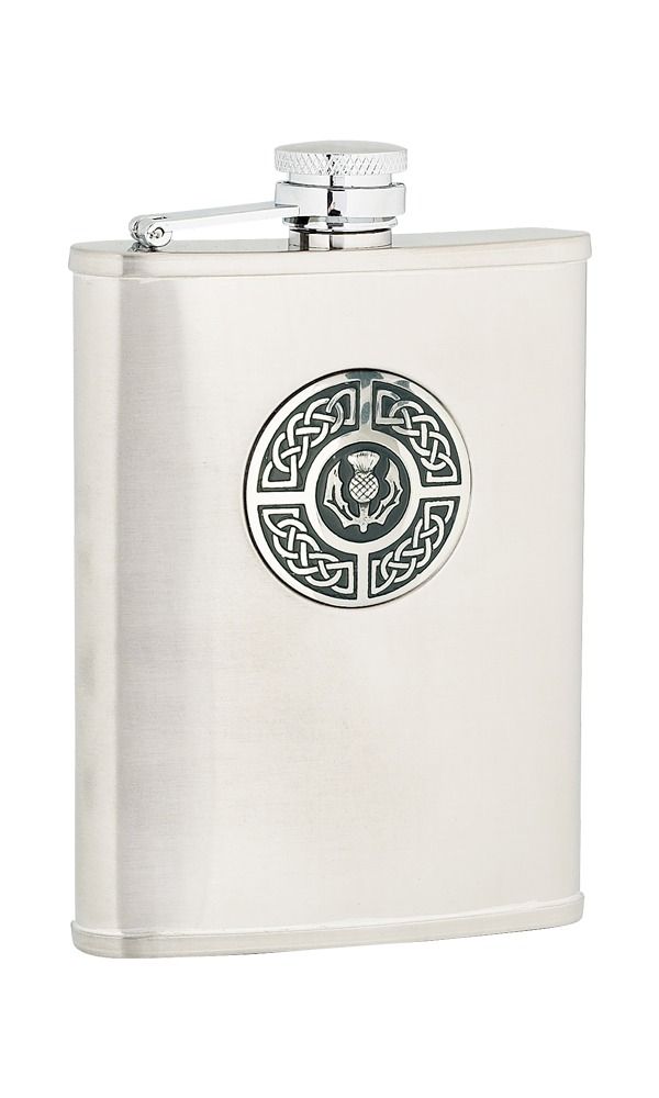 6oz Celtic & Thistle Stainless Steel Hip Flask with Captive Top in a Satin Finish.
