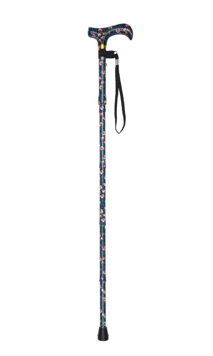 The aluminium walking stick is strong and lightweight and features a comfortable patterned wooden derby-style handle.