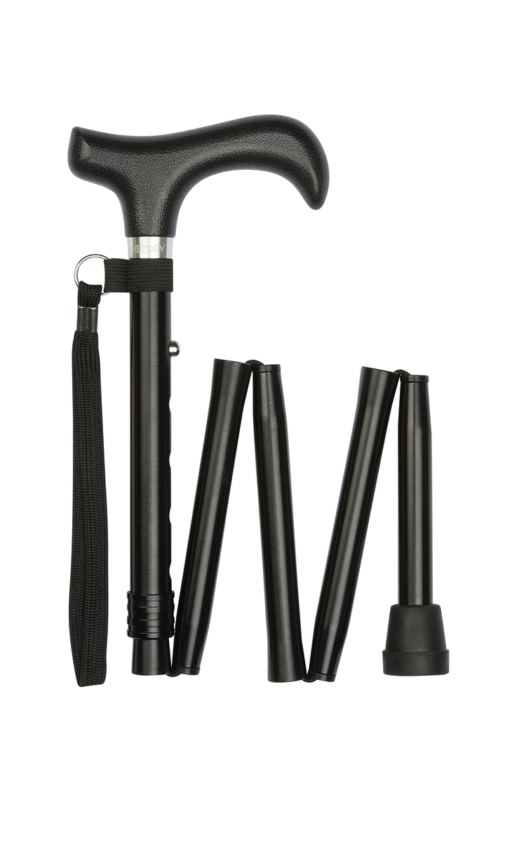 This strong and convenient height adjustable folding walking stick folds into 5 sections, making it small enough to fit into a handbag.