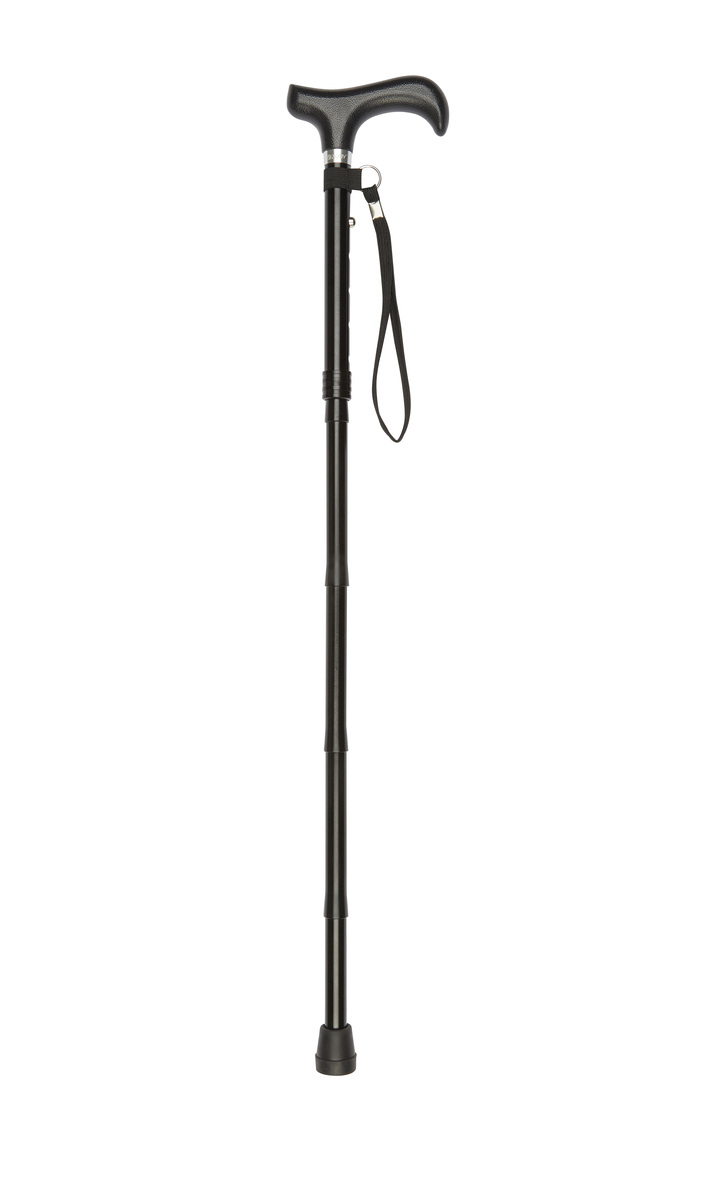 The aluminium walking stick is strong and lightweight and features a comfortable plastic derby-style handle.
