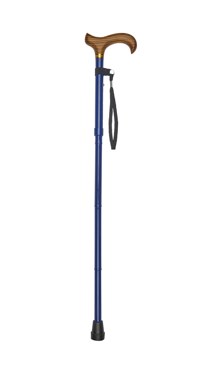 The aluminium walking stick is strong and lightweight and features a comfortable wooden derby-style handle.