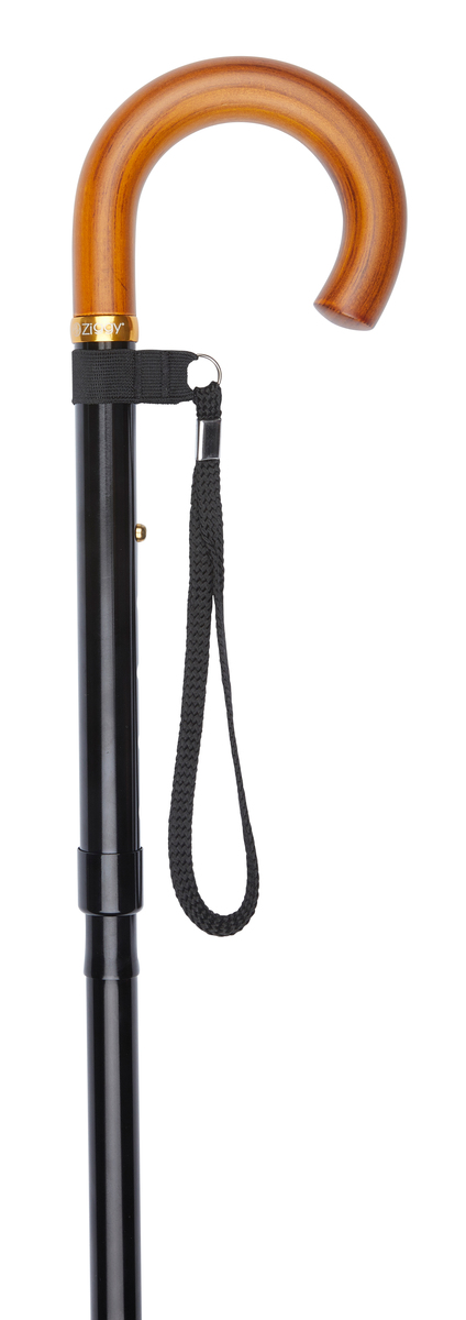 The aluminium walking stick is strong and lightweight and features a comfortable wooden crook-style handle.