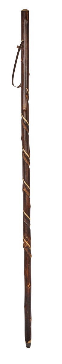 Chestnut hiker with spiral pattern, a metal ferrule and a brown leather wrist strap. Rustic wooden staff, ideal for country walks.