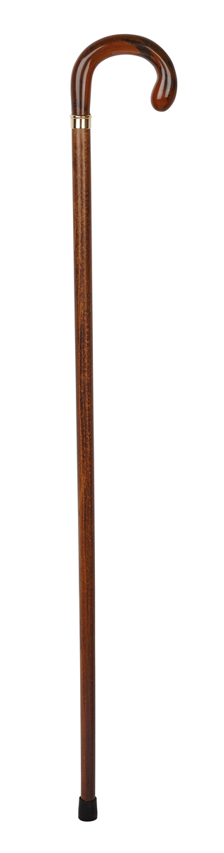 Stained beech crook handle stick with collar and rubber ferrule. It has a lacquered finish and is ideal for someone looking for a dressier or more formal walking stick.