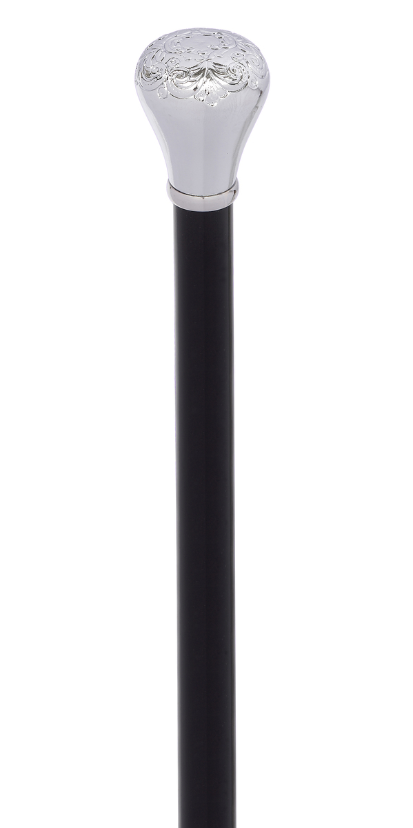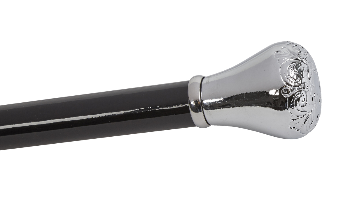 Decorative embossed chrome knob handle dress cane. Our chrome dress canes really stand out and will be the talking point of any formal event.