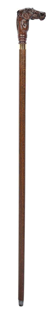 Racehorse collectors stick with a turned maple shaft, wood-effect resin handle, brass collar and metal ferrule.
