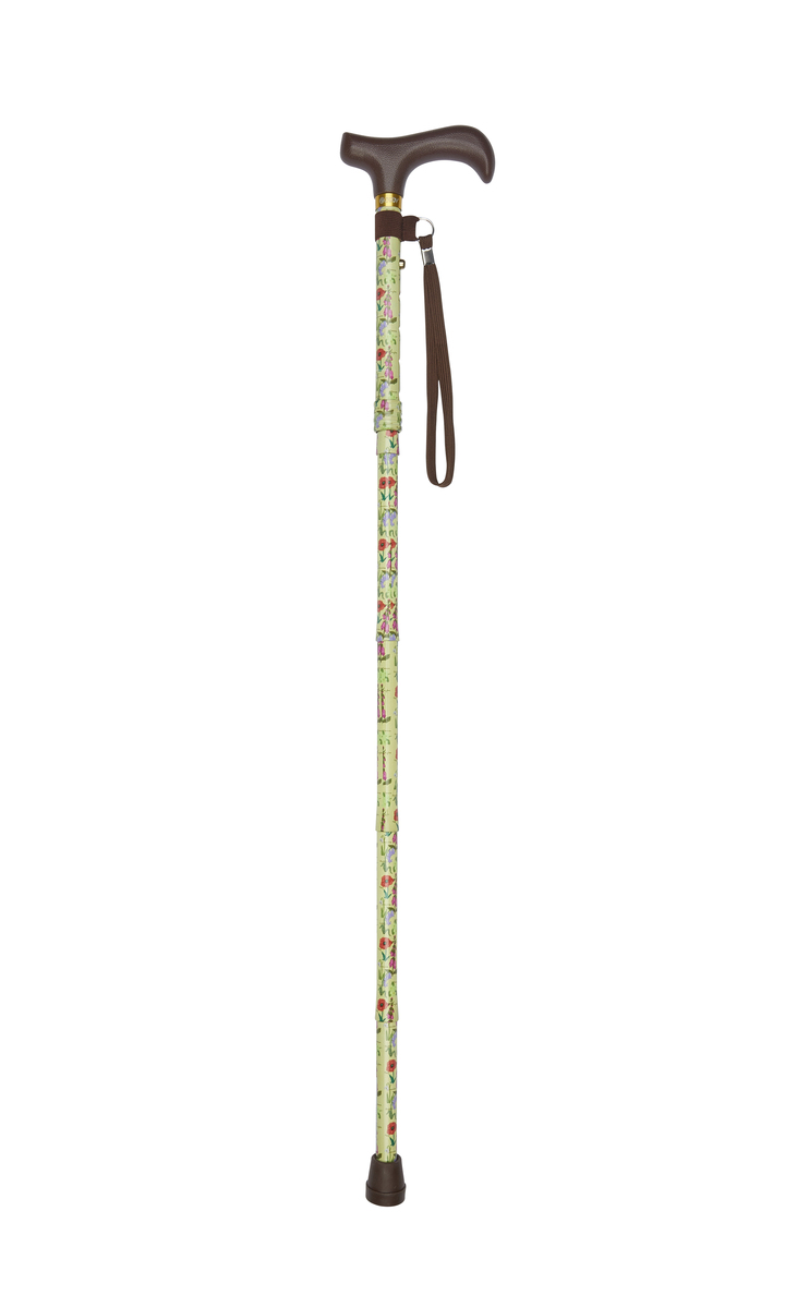This strong and convenient height adjustable folding walking stick folds into 5 sections, making it small enough to fit into a handbag. The bespoke pattern features poppies, foxgloves, primrose and bluebells.