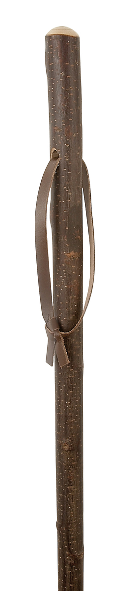 Natural chestnut hiker with bark, a metal ferrule and a brown leather wrist strap. Rustic wooden staff, ideal for country walks.
