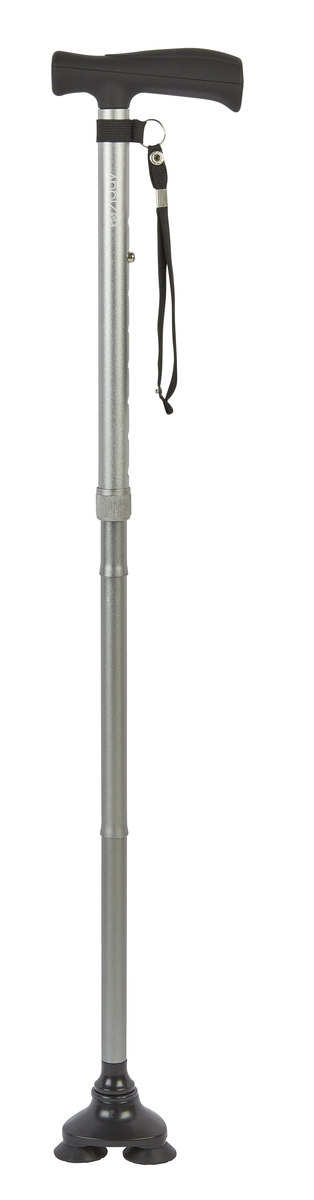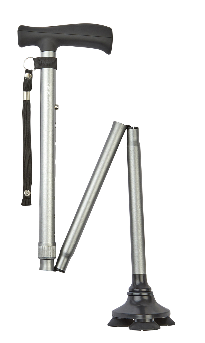 The Tribase has three rubber feet for extra grip which allows it to stand on its own. Strong and lightweight height-adjustable aluminium walking stick, that folds into 3 sections for convenience.