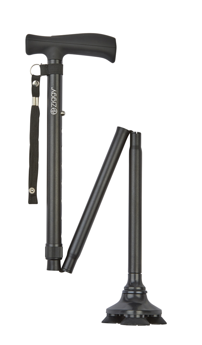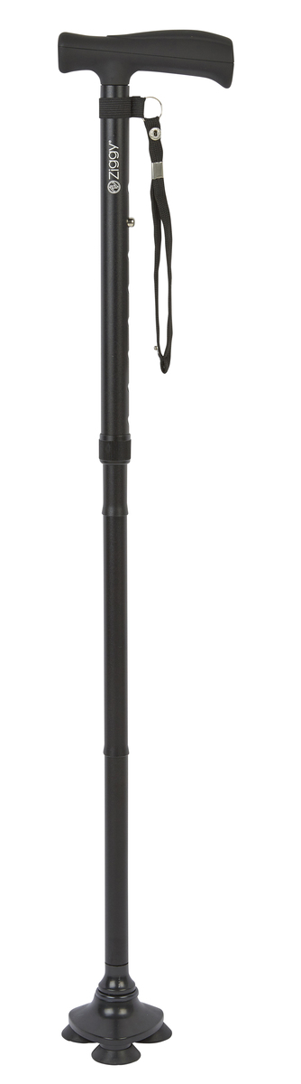 The Tribase has three rubber feet for extra grip which allows it to stand on its own. Strong and lightweight height-adjustable aluminium walking stick, that folds into 3 sections for convenience.