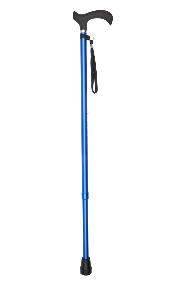 The aluminium walking stick features a comfortable plastic derby-style handle and includes a wrist cord and ferrule for added security and stability.