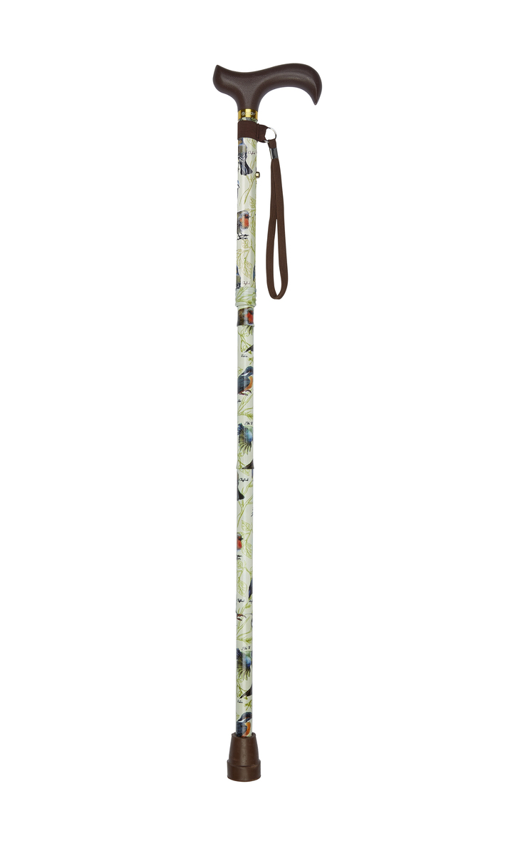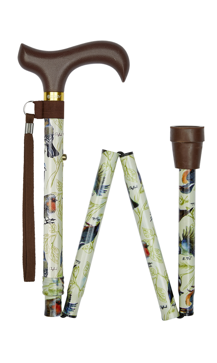 Fashionable, functional and foldable. This strong and convenient height adjustable folding walking stick folds into 4 sections and simply adjusts to the correct height. Beautiful hand-drawn garden birds design exclusive to Charles Buyers featuring a Robin, Blue Tit, Kingfisher, and Chaffinch.