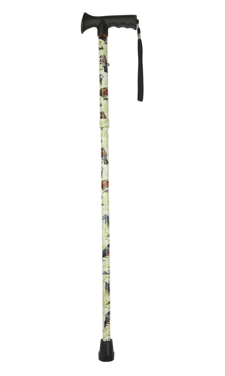 Fashionable, functional and foldable. This strong and convenient height adjustable folding walking stick folds into 4 sections and simply adjusts to the correct height. Beautiful hand-drawn garden birds design exclusive to Charles Buyers featuring a Robin, Blue Tit, Kingfisher, and Chaffinch.