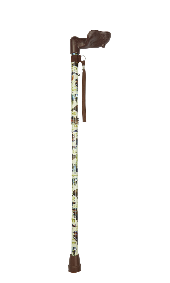 Fashionable, functional and foldable. This strong and convenient height adjustable folding walking stick folds into 4 sections and simply adjusts to the correct height. Beautiful hand-drawn garden birds design exclusive to Charles Buyers featuring a Robin, Blue Tit, Kingfisher, and Chaffinch.
