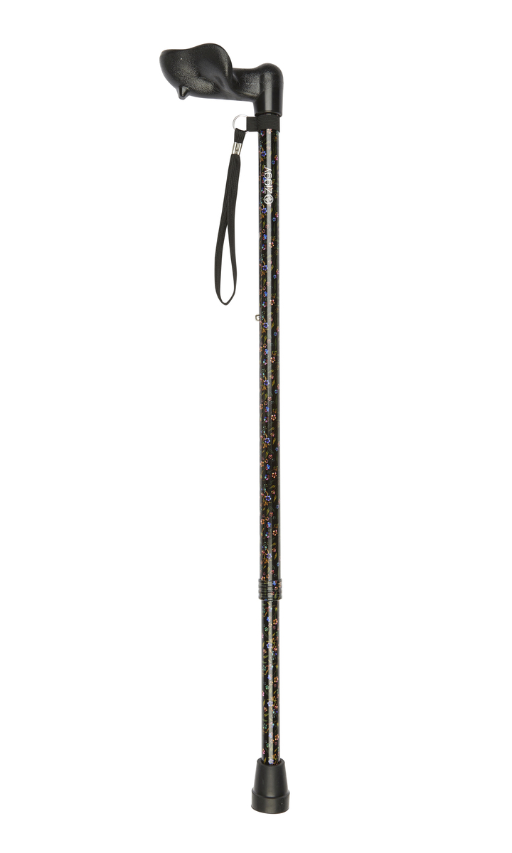 Black Floral Pattern Adjustable Stick With Anatomical Handle (Left Hand)