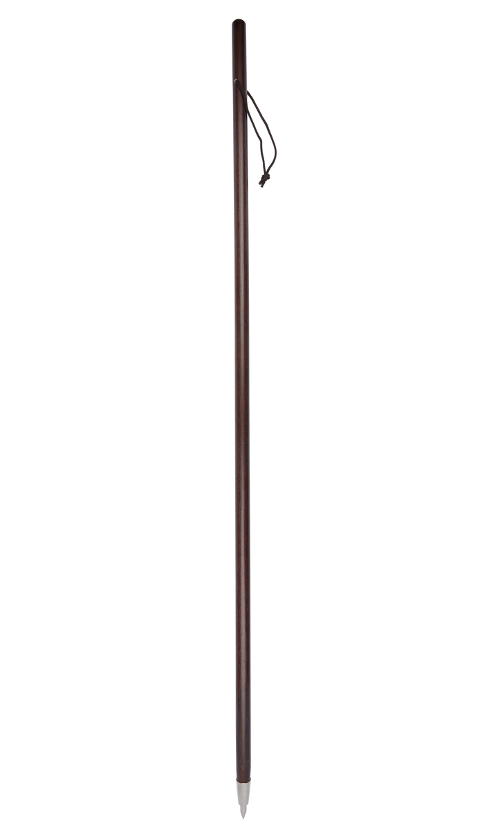 Chestnut hiker with spike ferrule and a brown wrist strap. Rustic wooden staff, ideal for country walks.