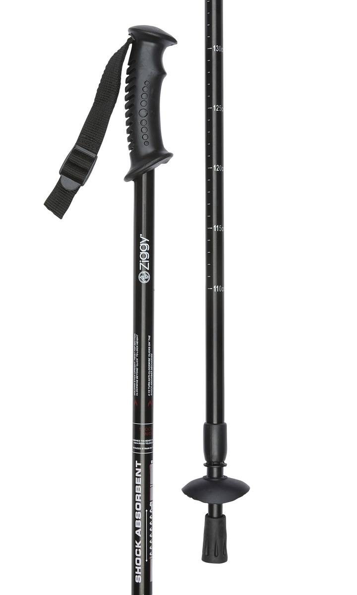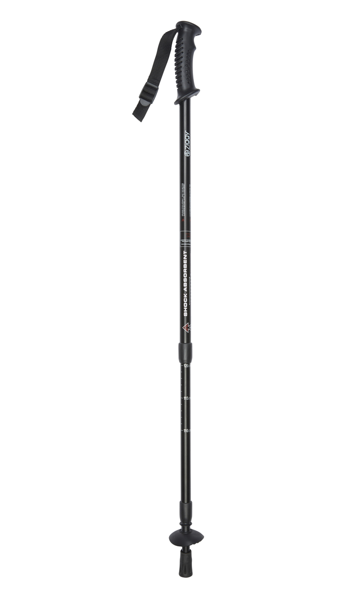 Black hiking pole. The hiking pole is made from a strong and lightweight aluminium construction. Adjustable in height it features a contour moulded handle, comfortable wrist strap and shock absorbing insert. The carbide steel tip and removable rubber ferrule make this hiking pole suitable for all types of walking surface. Adjustable in height from 63cm (25") to 135cm (53").