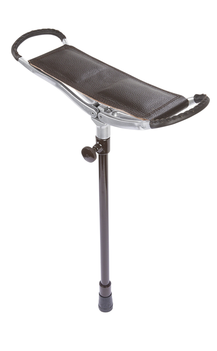 Brown leather adjustable shooting seat stick with rubber ferrule. A traditional shooting seat stick that combines elegance with practical use. It features a dark brown leather sling seat and coordinating leather-wrapped handles, accented by subtle stitching for a polished finish.